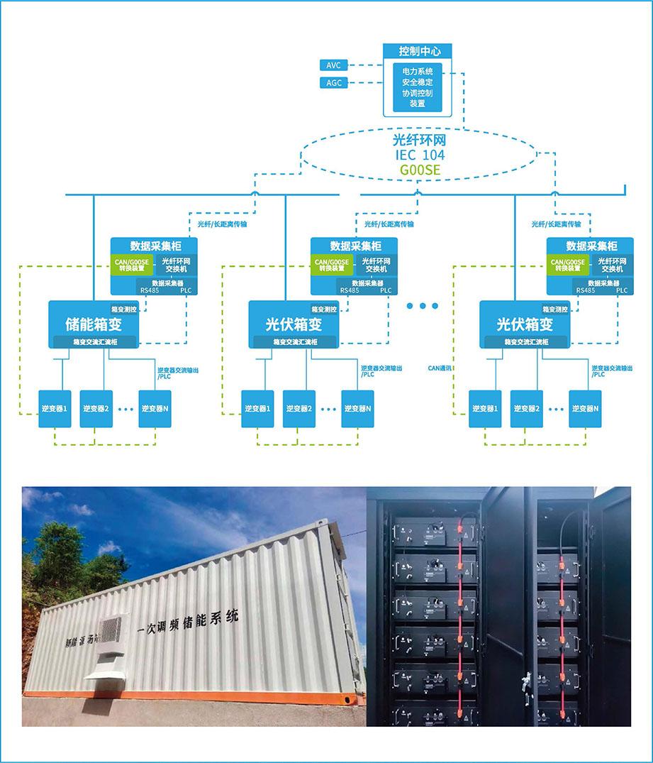 利用該系統(tǒng),單機或加裝獨立控制裝置,新能源發(fā)電廠可完成有功-頻率下垂特性控制,使其在并網(wǎng)點具備參與電網(wǎng)一次調(diào)頻響應(yīng)能力。可按照新能源交流側(cè)額定功率的10%~20%,儲能時長按照1h~2h進(jìn)行配置。本系統(tǒng)可控制分布式無功輸出,能滿足在30ms對AVC/AGC調(diào)度指令的響應(yīng),替代集中式的SVG設(shè)備。
